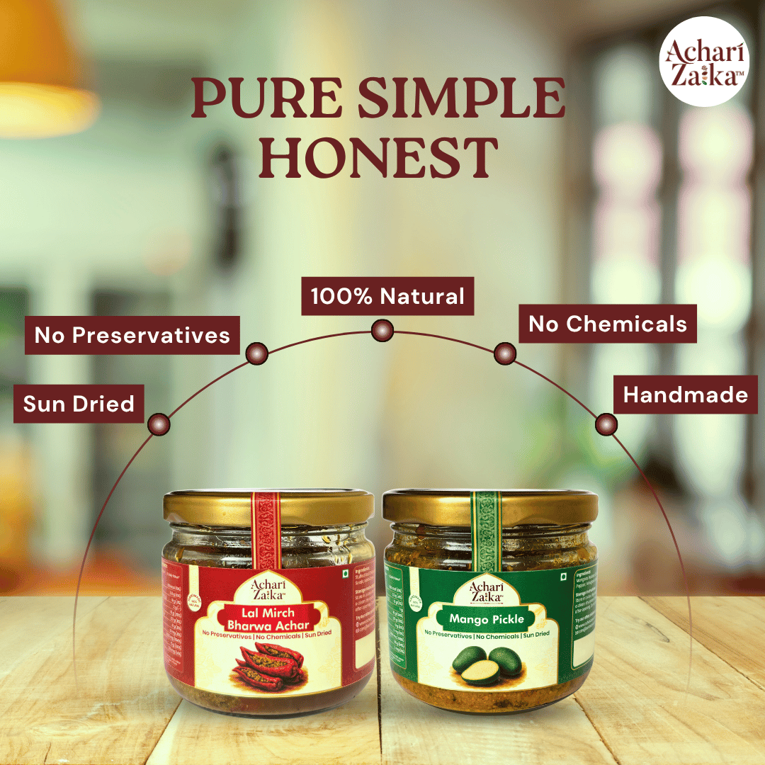 This combo balances the classic tang of aam ka achar with the heat of bharwa lal mirch ka achar, giving you two distinct flavours in one pack. Handmade, preservative-free, and chemical-free, both pickles carry the true zaika of Punjab. Perfect with parathas, rajma-chawal, poori, or simple rotis.