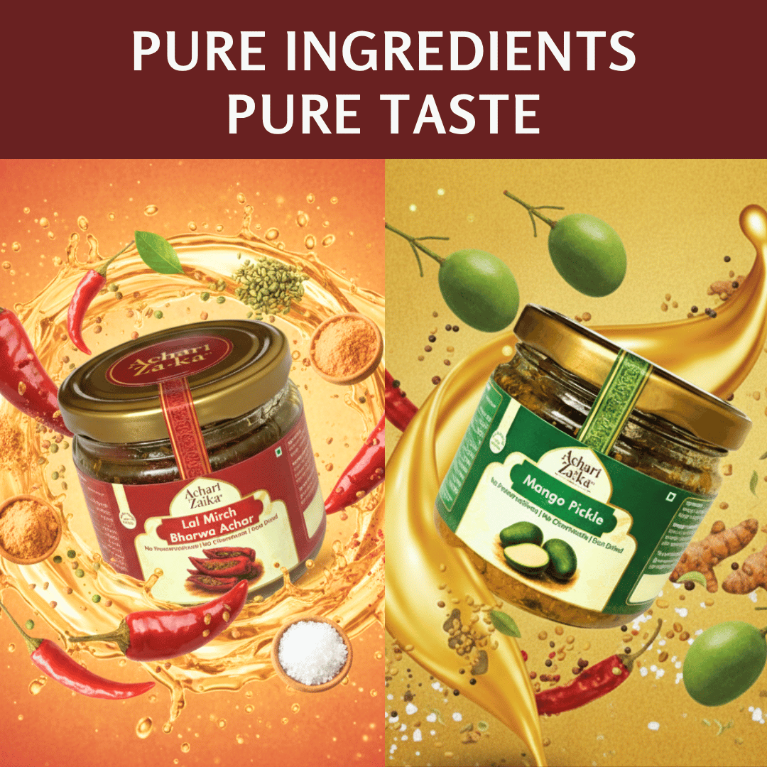 Add a tangy and fiery punch to your meals with the Achari Zaika Mango Pickle + Lal Mirch Bharwa Pickle Combo Pack.